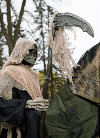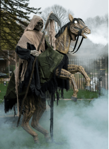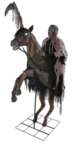 Make a creepy and scary Halloween decoration with this prop featuring nightmarish Reaper sits atop an eerie steed that bucks its Head with green light-up eyes and kicks its front legs. This prop is ideal for Halloween decoration