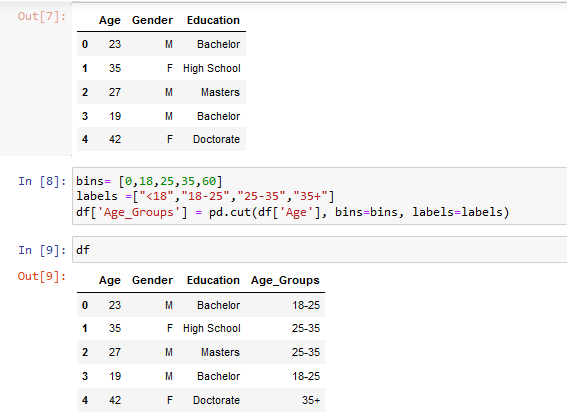 df=pd.DataFrame({‘Age’ : [23,35,27,19, 42],