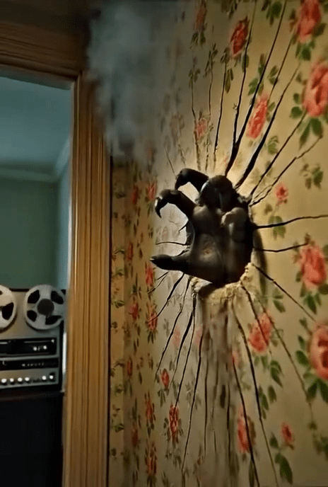 Emma stands frozen, the box of tapes heavy in her arms. The bulging hand in the wall peels back a long strip of wallpaper, revealing not lathe and plaster, but a void of impossible darkness. The dragging sound is loud now, just behind the surface.